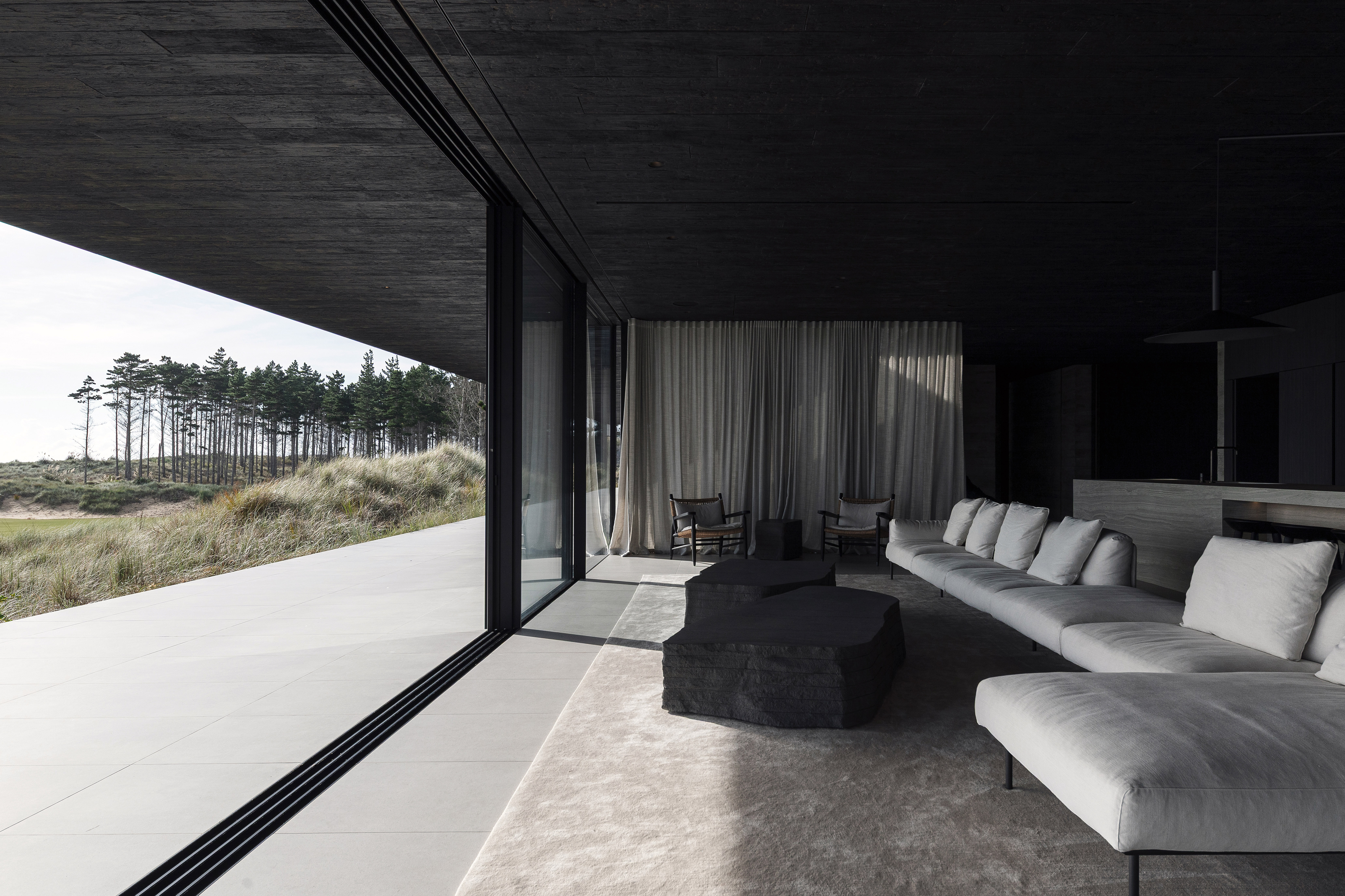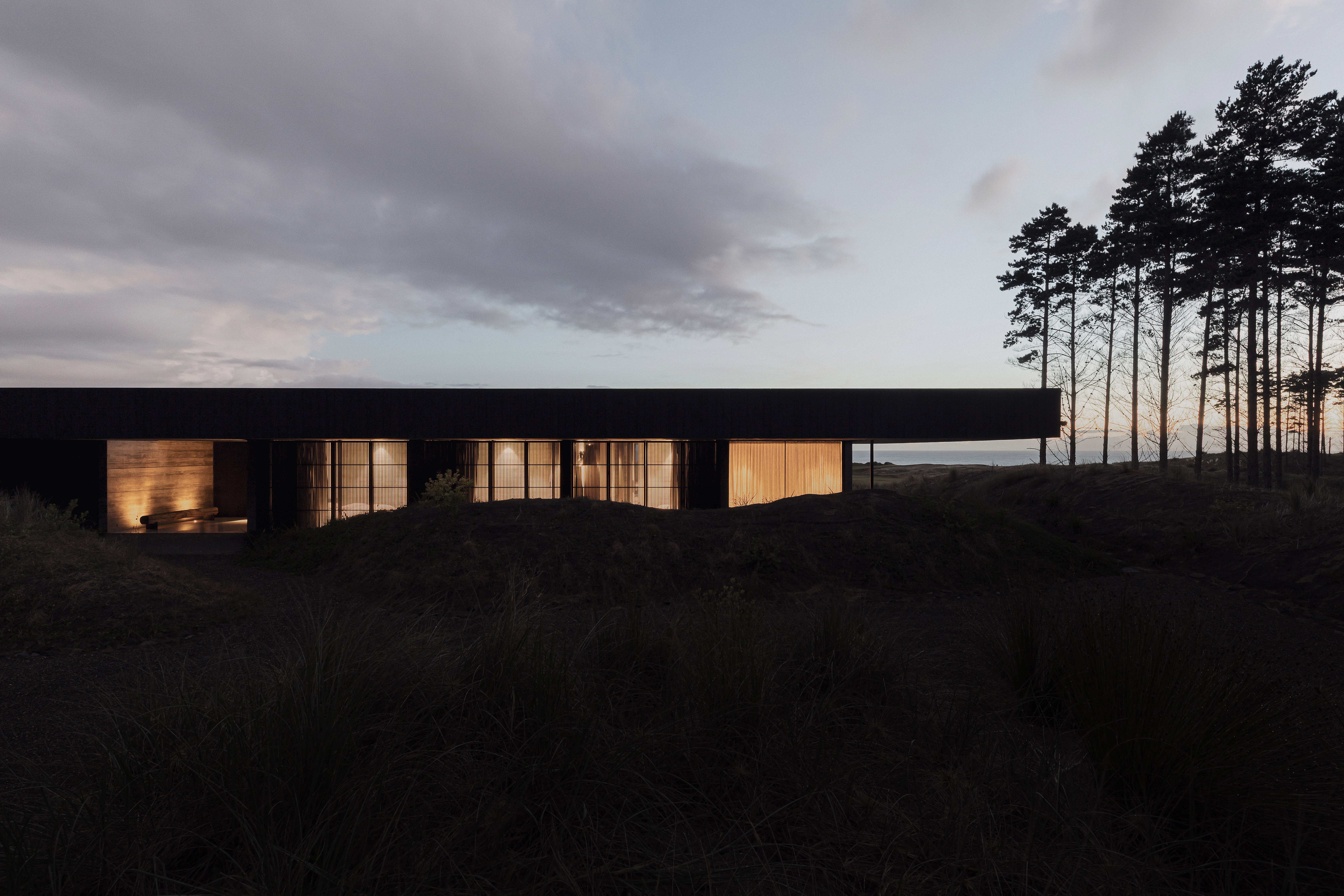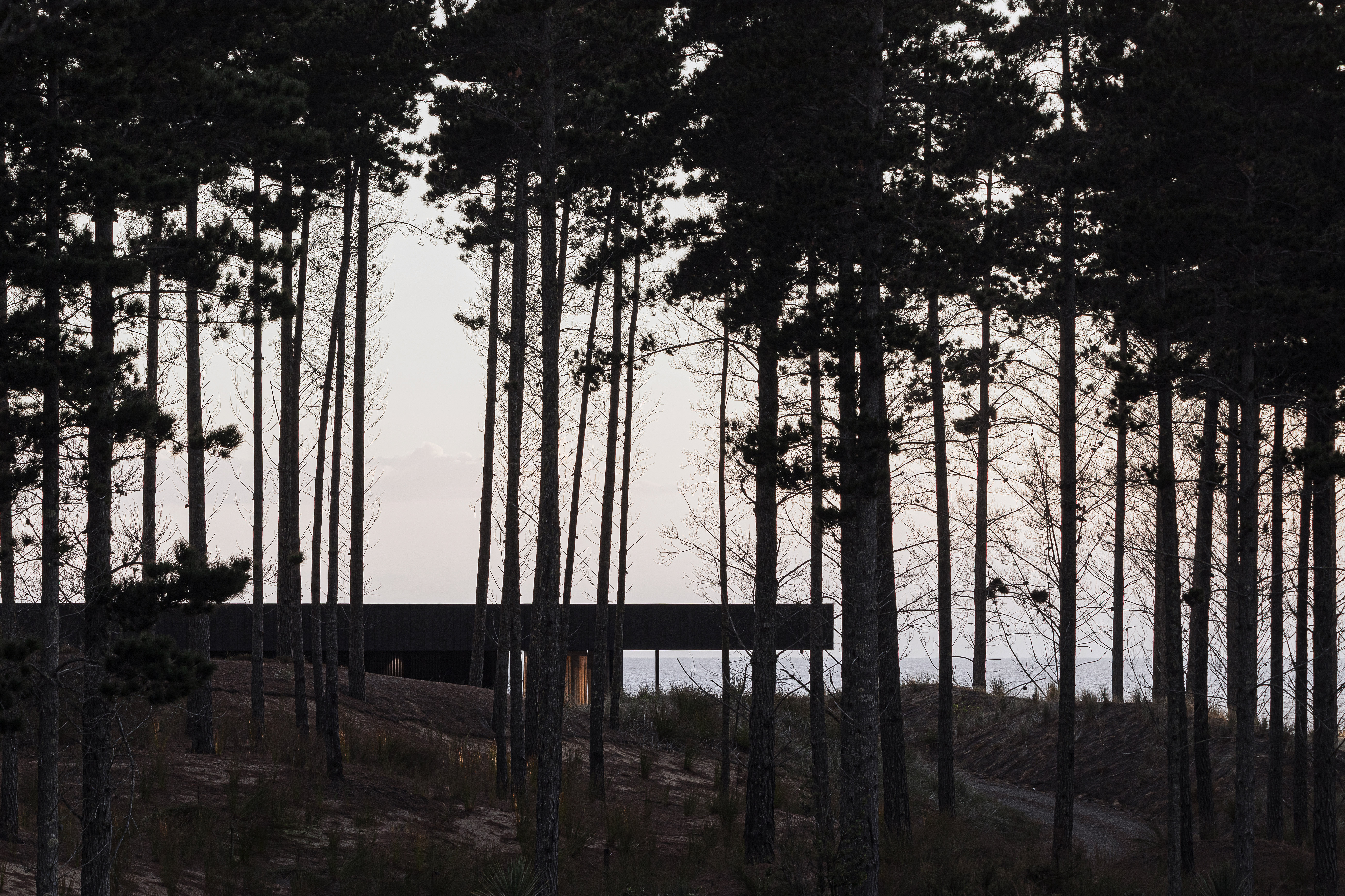 This single-storey private residence occupies the threshold between a stand of new-growth pines and an expansive dunescape. In response to the open, windswept site, the building is conceived conceptually as a single monolithic stratum, pushed low to the ground and hovering just above the surface of the sands.