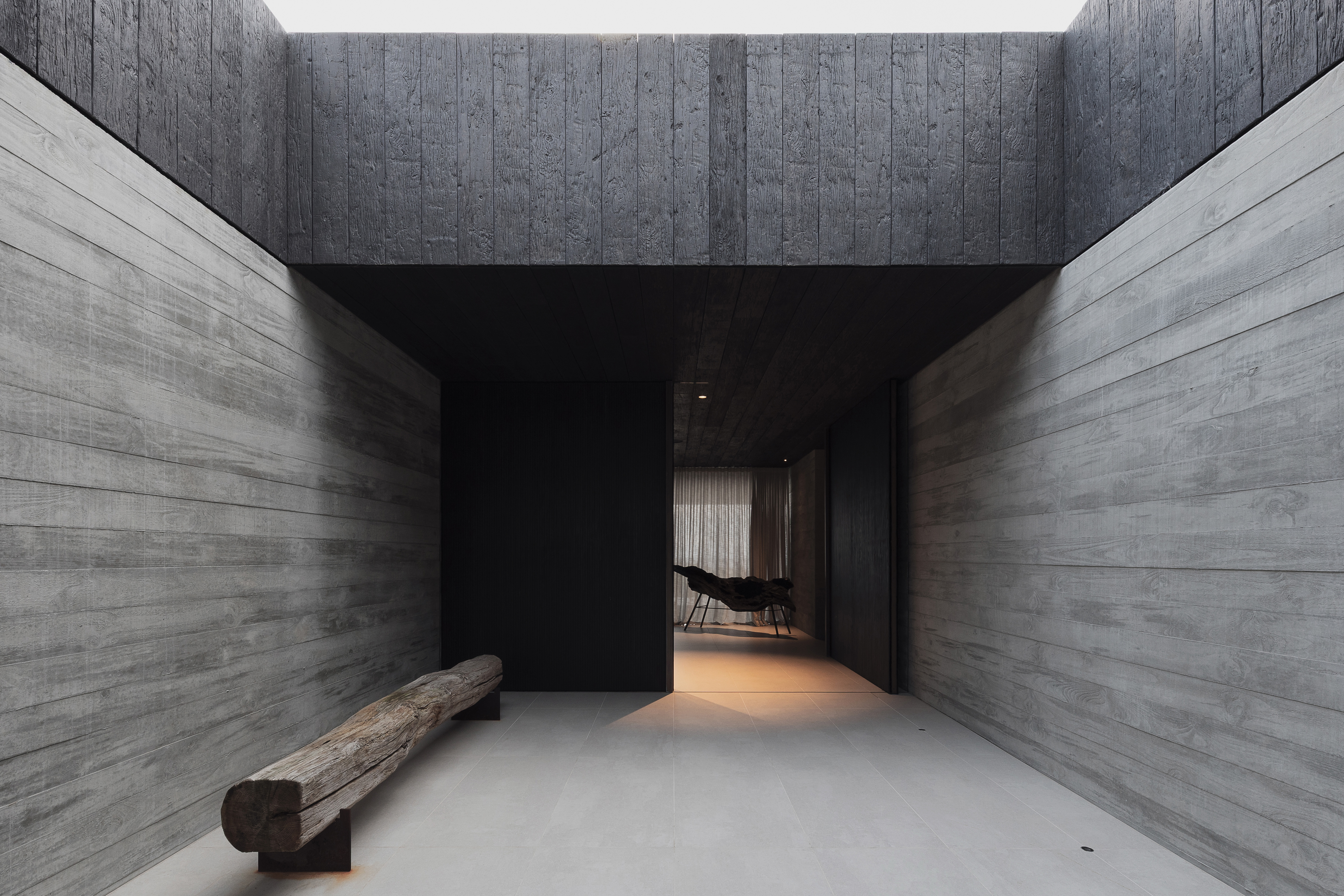 Heavy interior walls establish a haven within the seascape, while the light glass exterior allows for almost complete integration between interior and exterior and uninterrupted views of the Pacific Ocean. The primary living and private areas are surrounded by exterior courtyards, lightwells, and introspective spaces.