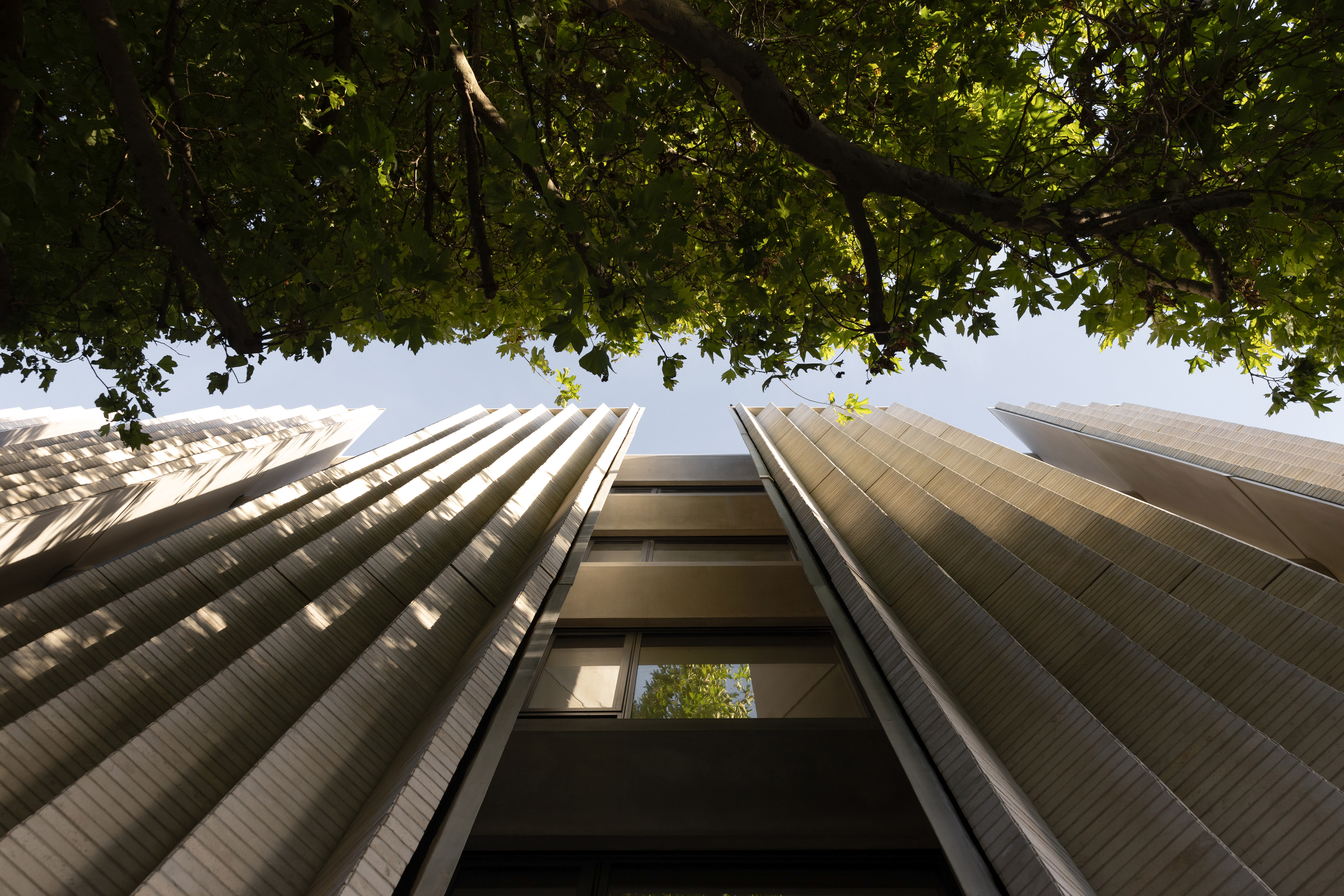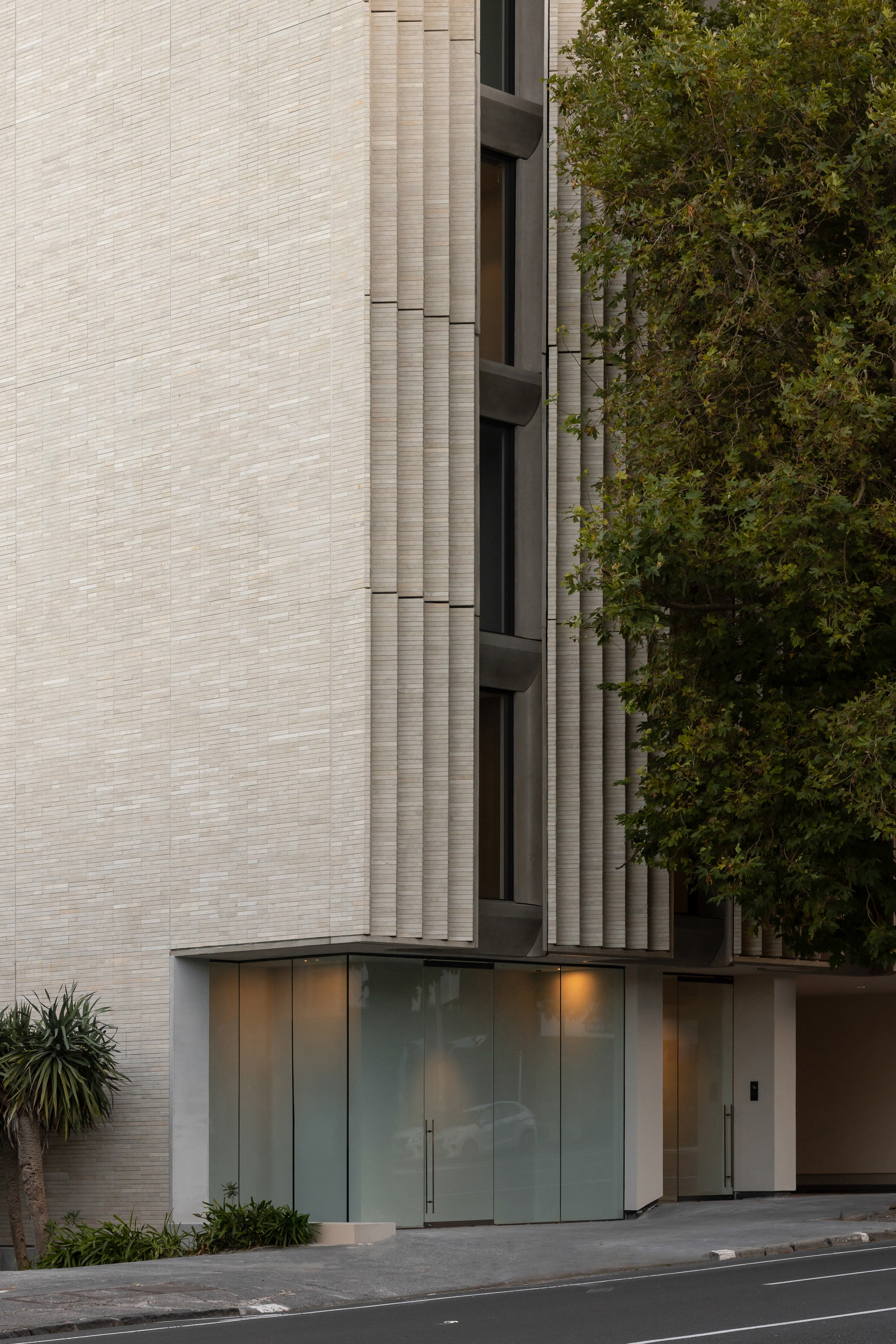 Clad in textured limestone brick and rendered concrete, the material palette shifts from tactile solidity to a soft refined interior. The continuous splayed stone screen spans four levels, filtering views and lending a sculptural modulation to the street frontage.